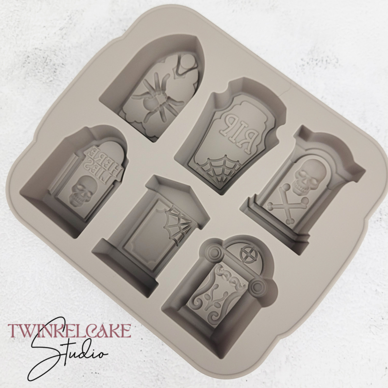 OverzichtZware silicone mal voor hat maken van 6 verschillende grafzerken. Lekker griezelig voor Halloween.