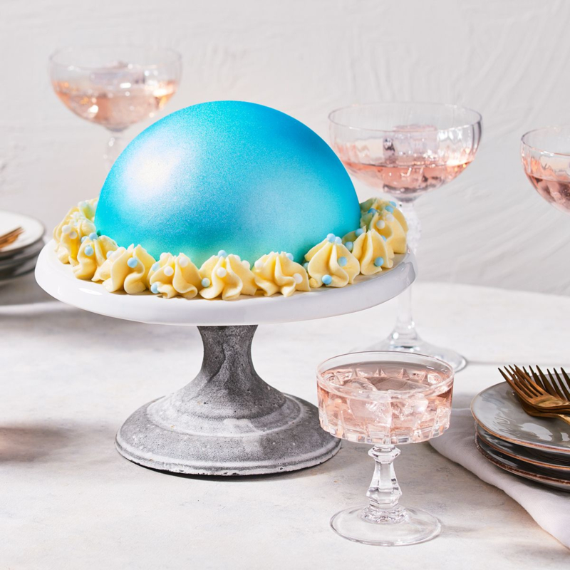 Geef je fondanttaarten, marsepeintaarten, chocolade, crèmes, gumpaste, modelleerpasta, koekjes en meer een prachtig blauw pareleffect. De FunCakes metallic spray droogt volledig op de taart, dus geen vingerafdrukken meer op de taart als je deze aanraakt.
