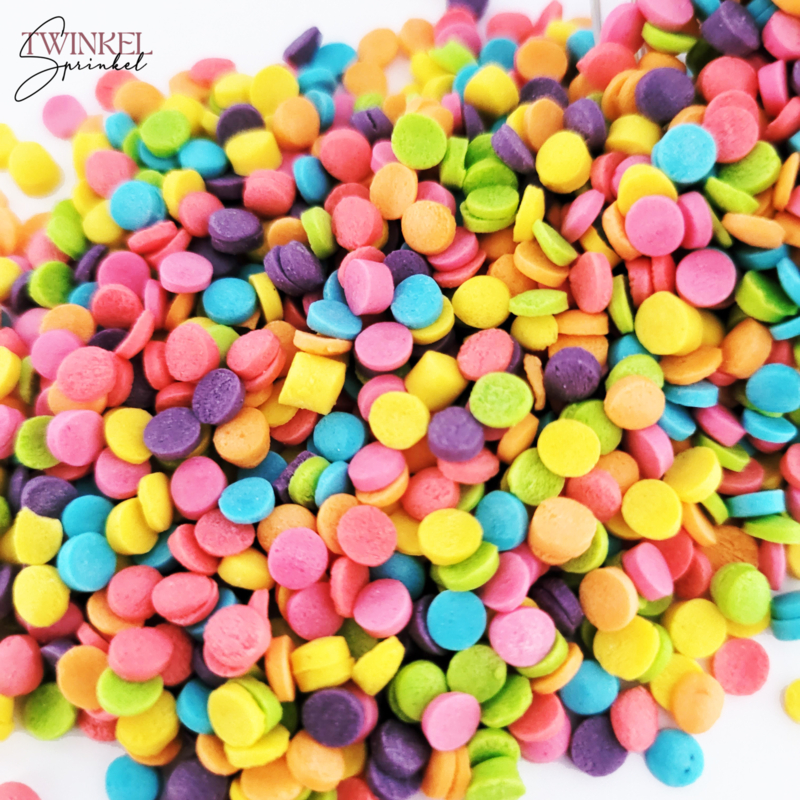 Twinkel Sprinkel Confetti Mix (5mm) - 60 grFeestelijke en kleurige confetti, met Twinkel Sprinkel strooisel kan U Uw taarten, cupcakes, donute, cake pops en andere gebak leuk opfleuren. De ronde cirkelvormige en platte confetti met diameter van ca 5 mm is eenvoudig in…