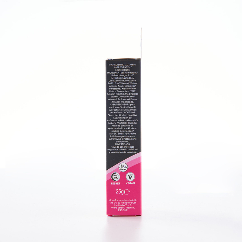 Zutaten: Glyzerin, Siliziumdioxid, Propylenglykol, Farbstoffe: E122 kann die Aktivität oder Aufmerksamkeit von Kindern beeinträchtigen.