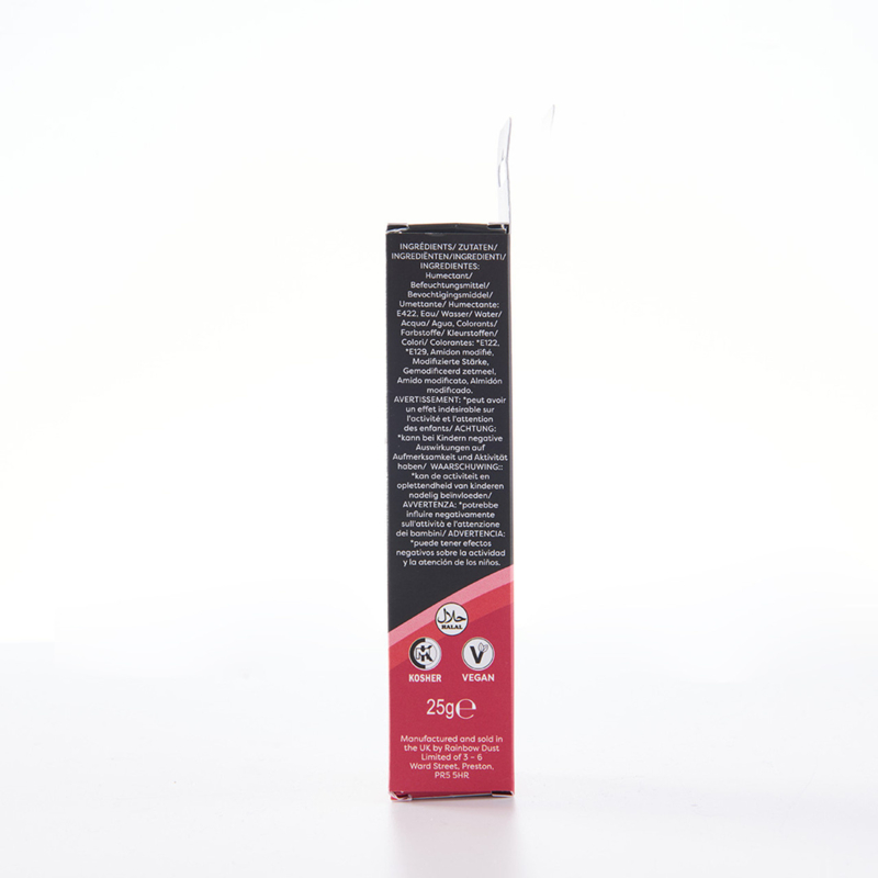 Zutaten: Feuchthaltemittel: E422, Wasser, Farbstoff: E122, E129, modifizierte Stärke (Tapioka).