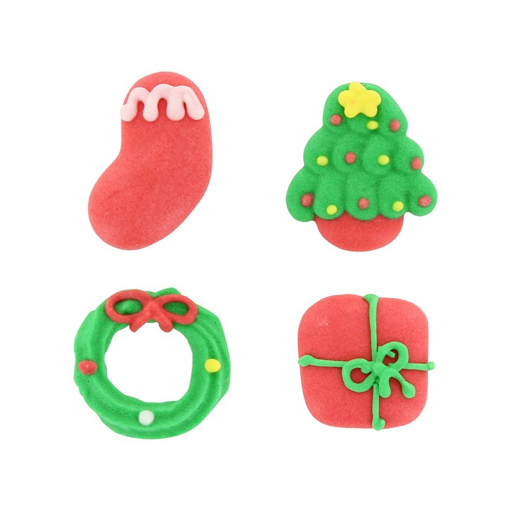 Kleine Zuckerdekoration verpackt in einer Blisterpackung. Die Zuckerdekoration ist vollständig essbar und macht sich sehr gut auf Torten, Cupcakes oder anderen Kreationen. Das Set enthält eine Socke, einen Weihnachtsbaum, einen Weihnachtskranz und ein Geschenk.
