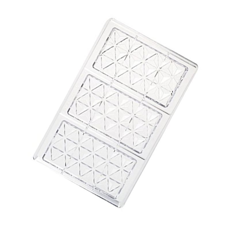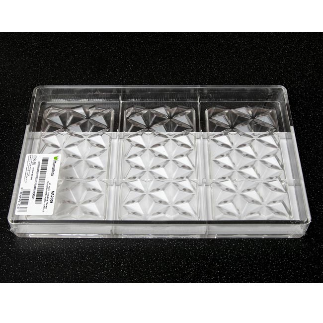 Diese Form für eine Tablette Pyramide ist sehr einfach zu benutzen und besteht aus Polycarbonat. Sie ergibt eine Tablette mit einem Gewicht von 80 Gramm. In dieser Form befinden sich 3 Tabletten. Sie erhalten also 3 Riegel von 80 Gramm.