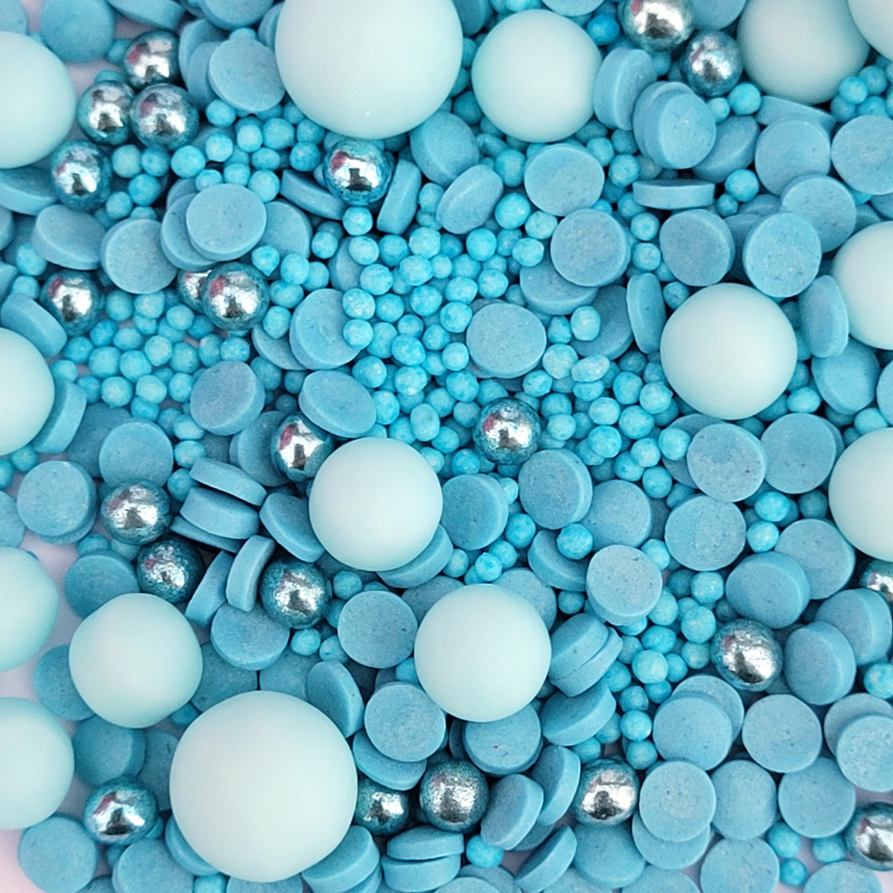 The sprinkles consist of sugar pearls, confetti, and strands, all in shades of blue. Colorfast when used on buttercream or ganache.
