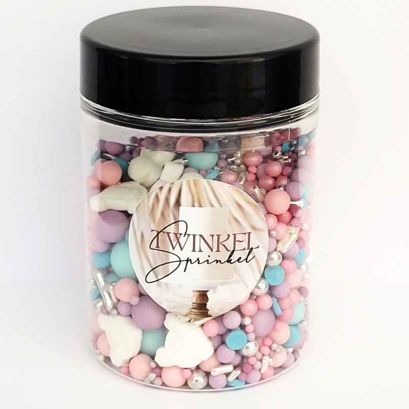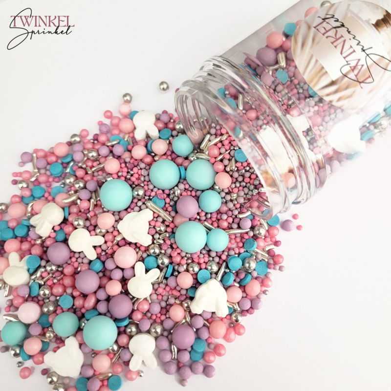 The sprinkles mix consists of white rabbit heads, purple sugar pearls and musket seeds, blue sugar pearls and confetti pink sugar pearls and silver strands.