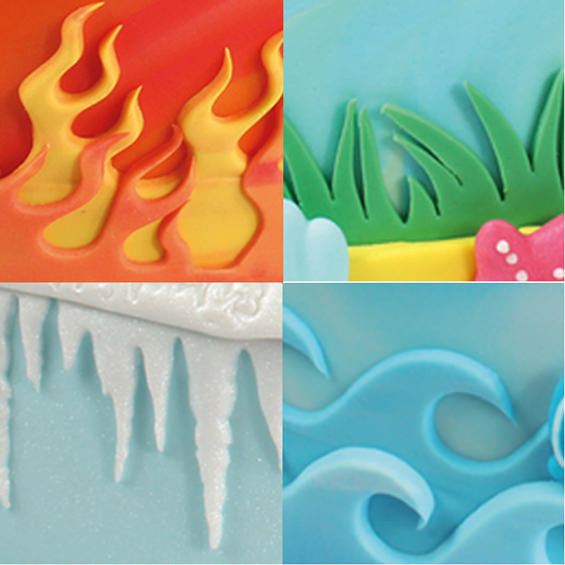 OverviewThe FMM element tappit set contains out of four different element designs: grass, icicles, waves and flames. These versatile tappits can be used to add decorations and details to a variety of cakes and cupcakes.