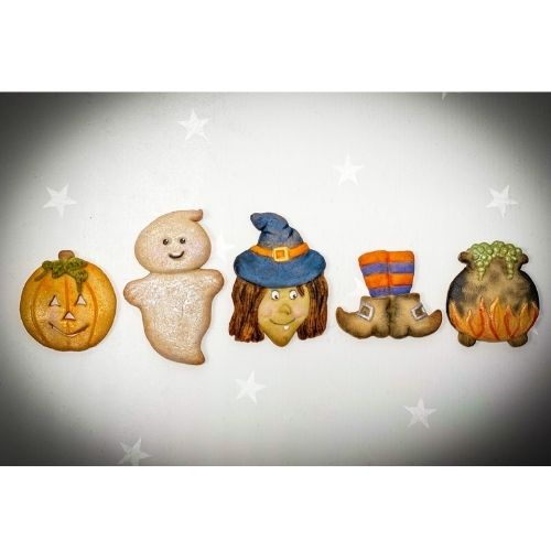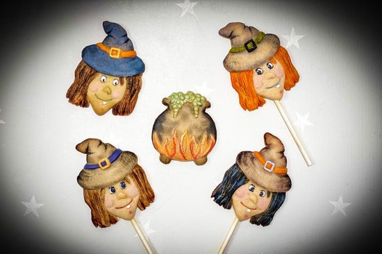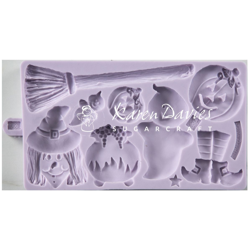 - The mould contains 9 mini designs: two ghosts, two pumpkins, a star, a witch's head, broom, witch's legs and a cauldron.