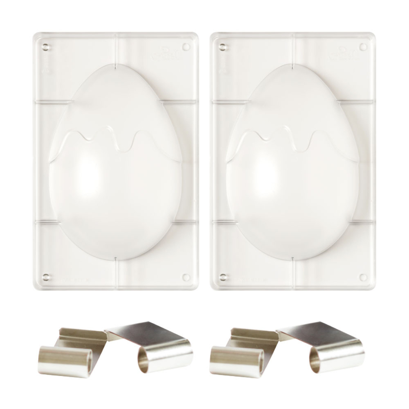 Kit consisting of 2 polycarbonate egg molds and 4 chromed springs, perfect for making chocolate eggs in a single step. Practical step-by-step brochure contained inside. If you want to get colored eggs, brush the mold with fat-soluble dye or add it to melted chocolate. You can also paint floral motifs or abstract decorations. Have fun customizing eggs with decoracroissant in royal ice or using decoraready to use sugar.