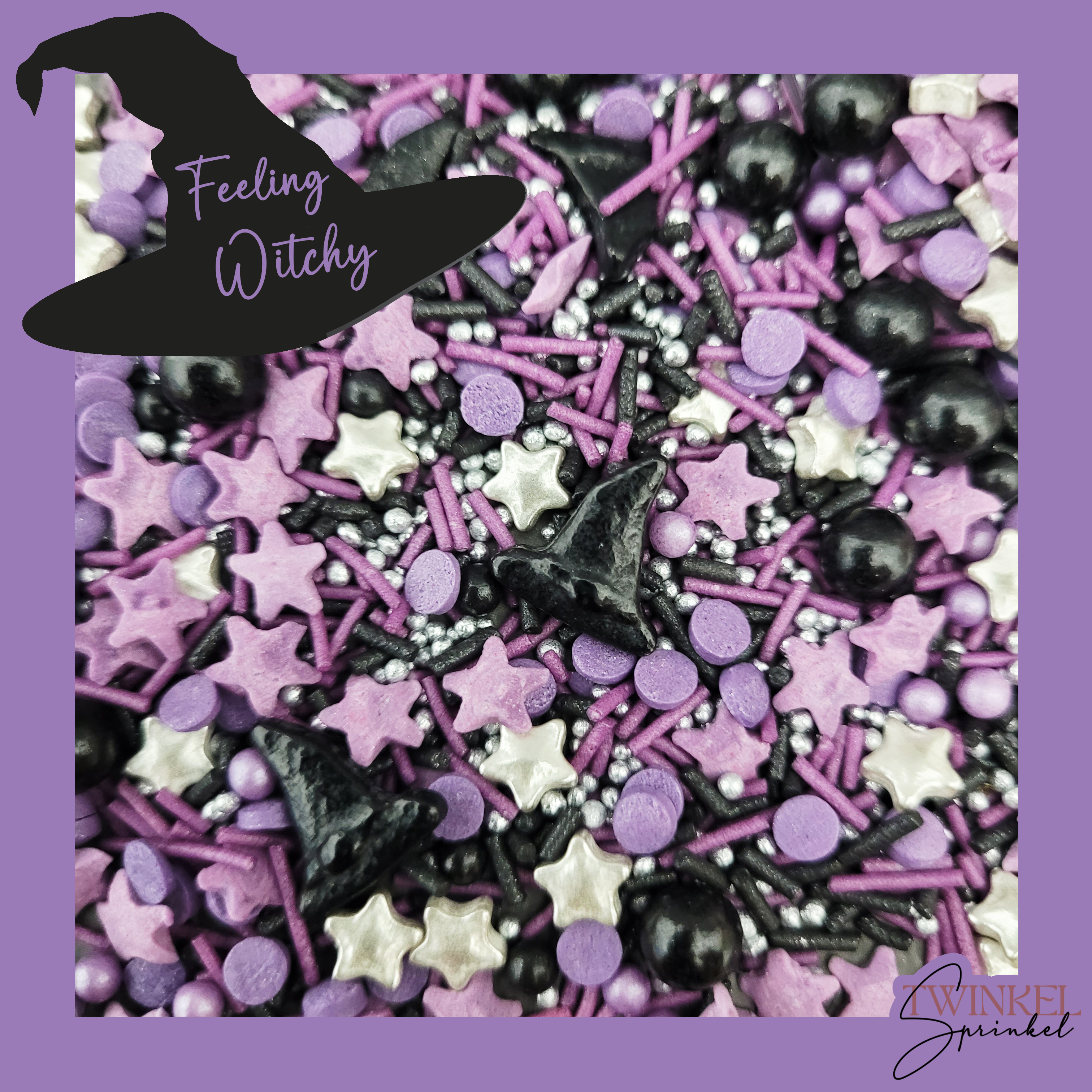 AperçuMélange coloré Twinkel Sprinkel avec des chapeaux de sorcière, parfait pour décorer des cupcakes, des beignets, des gâteaux et autres pâtisseries à l'occasion d'Halloween. Couleurs résistantes sur la crème au beurre et la ganache.