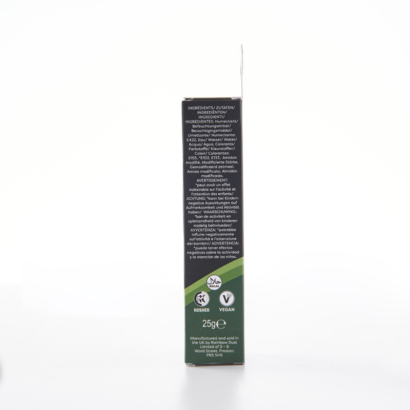 Ingrédients : humectant : E422, colorant : E155, E102, E133, eau, amidon modifié (tapioca).