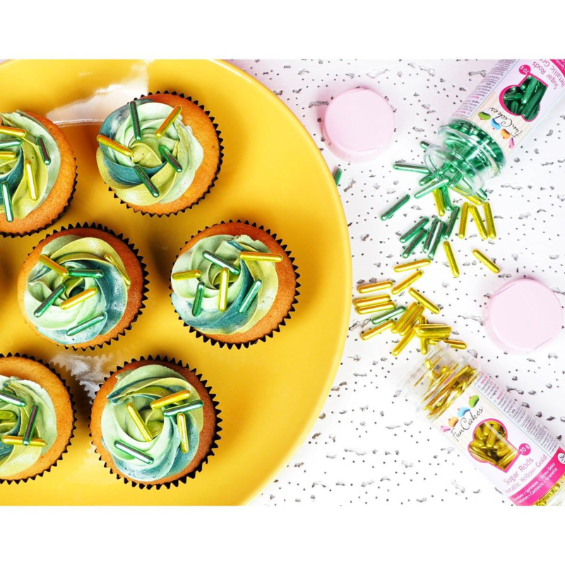 AperçuLes bâtonnets en sucre métallisé jaunes or de FunCakes mesurent env. 2 cm de long et sont parfaits pour la décoration de vos cupcakes et gâteaux. Les bâtonnets sont conditionnés dans un emballage pratique.